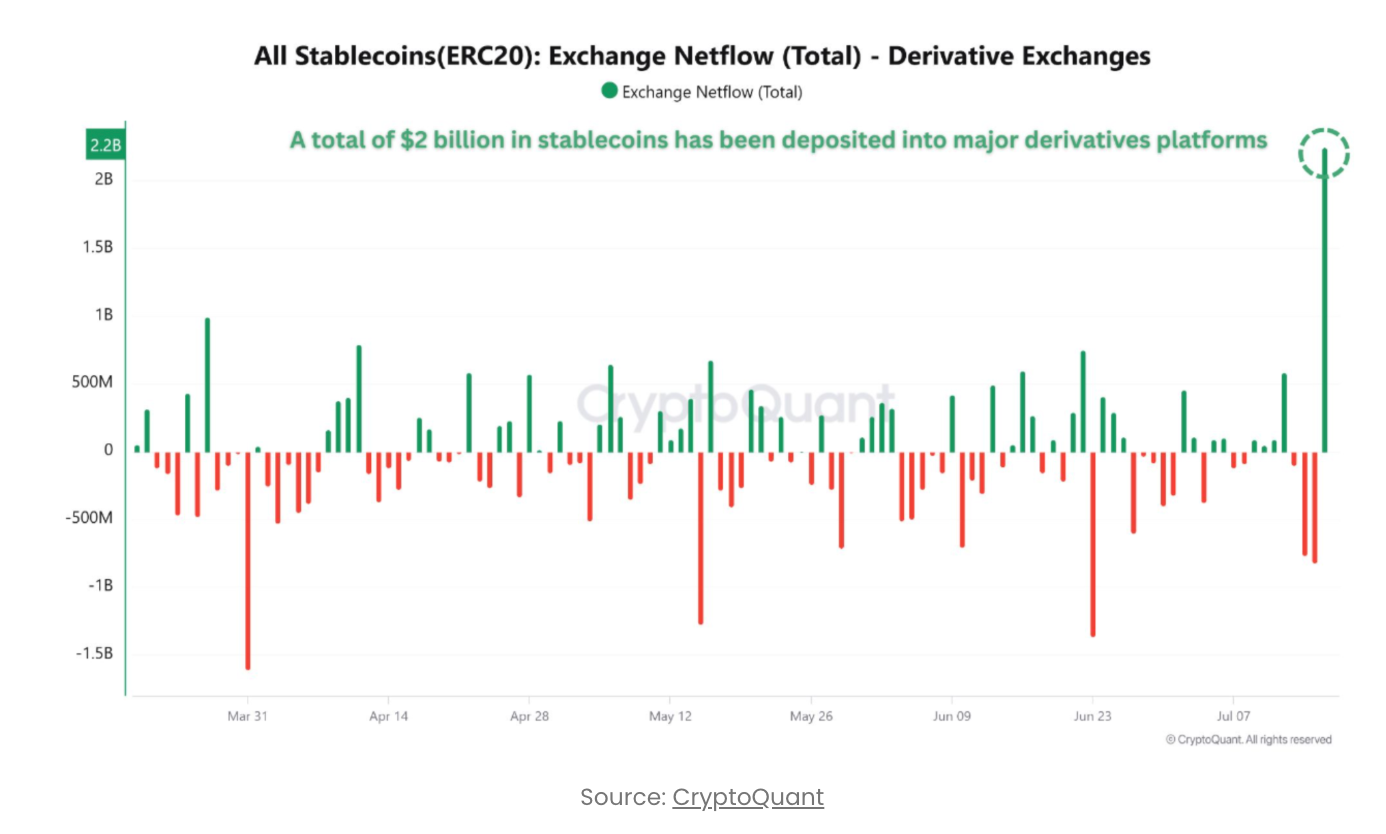Стейблкоин инъекция или толчок к росту Биткойна Согласно данным Quicktake, опубликованным аналитиком CryptoQuant Амром Тахой, сегодня утром на основные платформы производных финансовых инструментов было вложено более 2 миллиардов долларов в стейблкоины, в основном в USDT. Этот массовый приток рассматривается как признак того, что профессиональные трейдеры готовятся открывать длинные рычажные позиции, что указывает на оптимистичные ожидания рынка по поводу будущей динамики Биткойна.