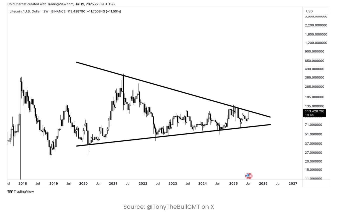 Известный рыночный технический аналитик и сертифицированный специалист CMT Тони Северино заявил на платформе X, что Litecoin находится на завершающем этапе "многолетней симметричной треугольной конвергенции", что предвещает возможный взрывной прорыв.