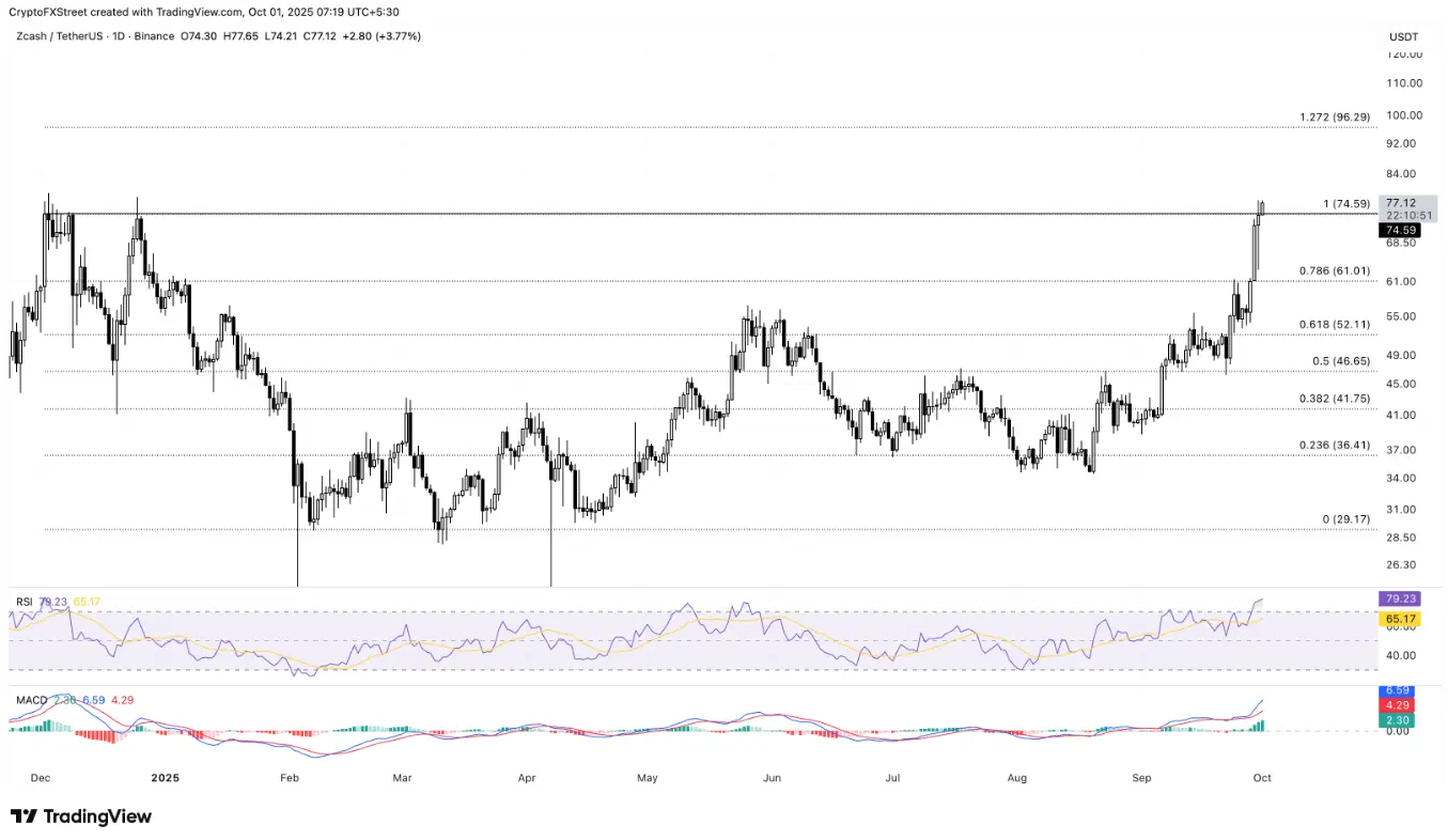 К среде ZEC торговался около 76 USD, зафиксировав четырехдневный рост подряд. Ранее эта монета близко подходила, но не смогла закрыться выше 52-недельного максимума на уровне 74,59 USD в торговой сессии во вторник.