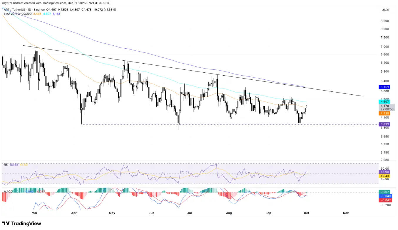 На крипторынке APT продолжает фиксировать рост более чем на 1%, что отмечает шестую последовательную сессию повышения. Отскок начался от уровня поддержки 3,893 USD в пятницу, после чего цена преодолела 50-дневную EMA на уровне 4,438 USD.