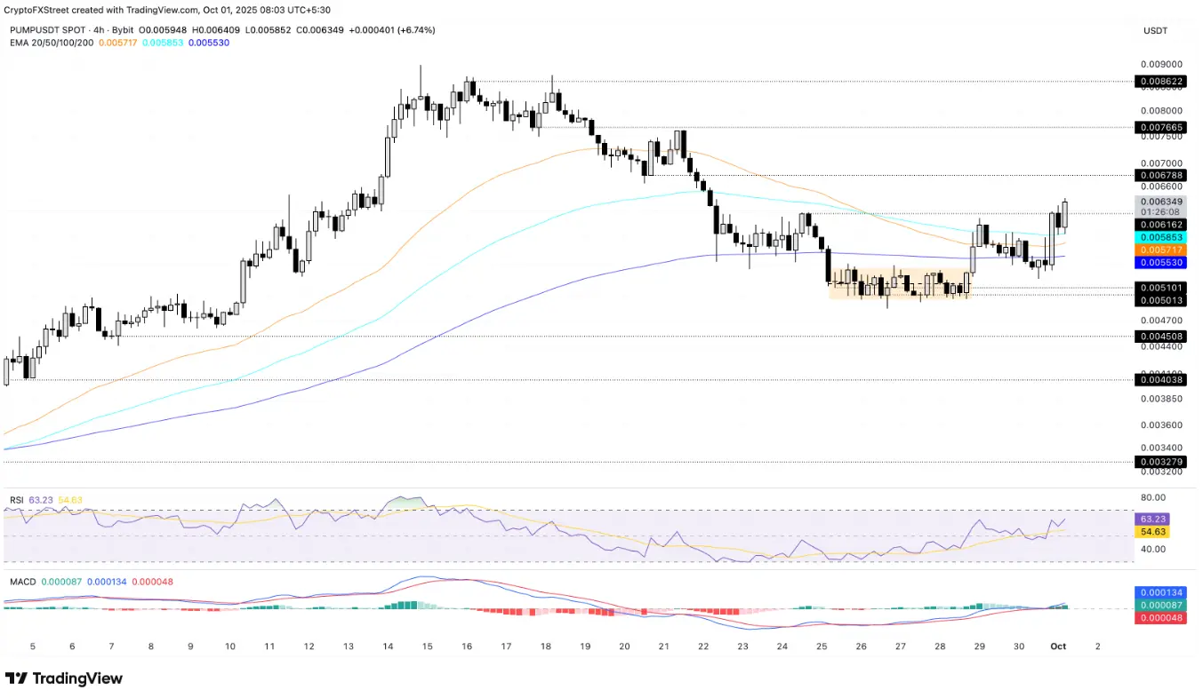 Выручка и объем выкупа | Источник: Pump.funК среде PUMP вырос почти на 7%, преодолев важное сопротивление на уровне 0,006162 USD – пик, установленный в четверг на прошлой неделе. Если цена сможет закрыться стабильной выше этой отметки в 4-часовом интервале, восходящий тренд Pump.fun, вероятно, будет укреплен и расширен.