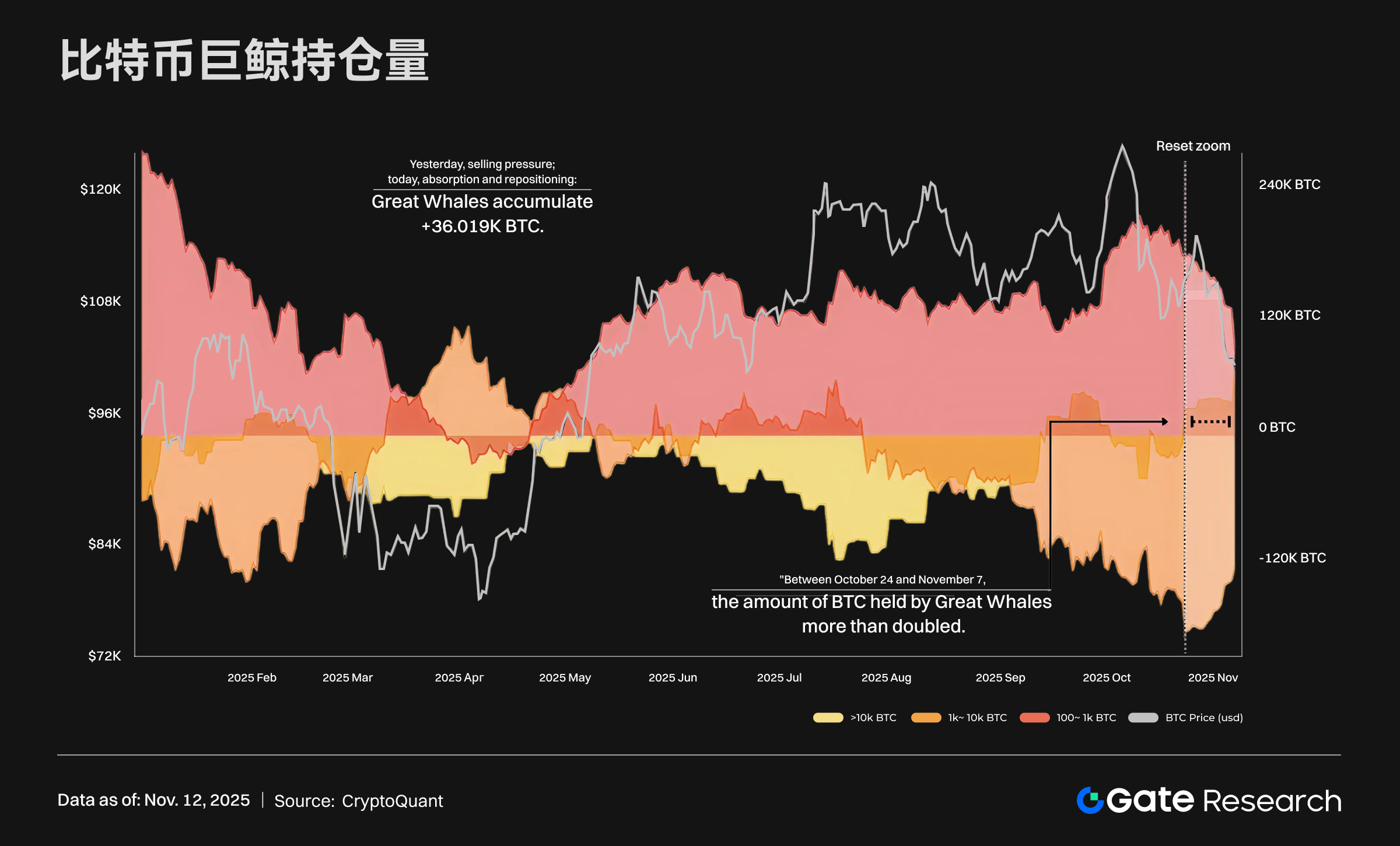 Согласно данным CryptoQuant, с 24 октября по 7 ноября объемы удержания биткойнов крупными держателями удвоились всего за две недели, увеличившись на более чем 36 000 BTC. Эта волна концентрации покупок произошла во время краткосрочной коррекции на рынке, что показывает, что крупные инвесторы активно накапливают активы на низких уровнях, обеспечивая твердую поддержку цен. Продолжительный приток средств от крупных держателей усиливает рыночную уверенность в эмоциональном плане, позволяя BTC сохранять сильную волатильность около 100 000 долларов, без явных признаков продаж.