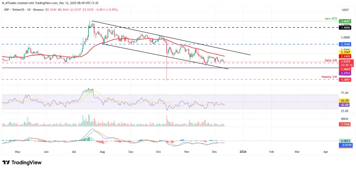 Цена XRP отскочила от уровня поддержки в 1,96 USD в воскресенье, зафиксировав рост на 3,66% за два следующих дня. Однако в среду продавцы вновь активизировались, что привело к сильной коррекции, практически стерев предыдущий рост, и снова опустили цену к уровню 1,96 USD в следующей сессии. На момент пятницы цена колеблется около 2,03 USD, что отражает осторожность рынка.