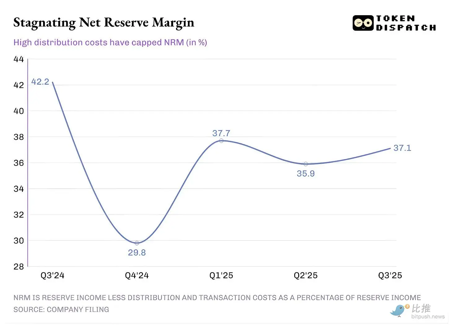 В третьем квартале доля USDC, непосредственно удерживаемая на платформе Circle, увеличилась на 4,5 процентных пункта. Хотя этот процент невелик, он имеет решающее значение для маржи прибыли. Каждый процент, перенесённый на баланс «на Circle», увеличивает маржу прибыли RLDC.