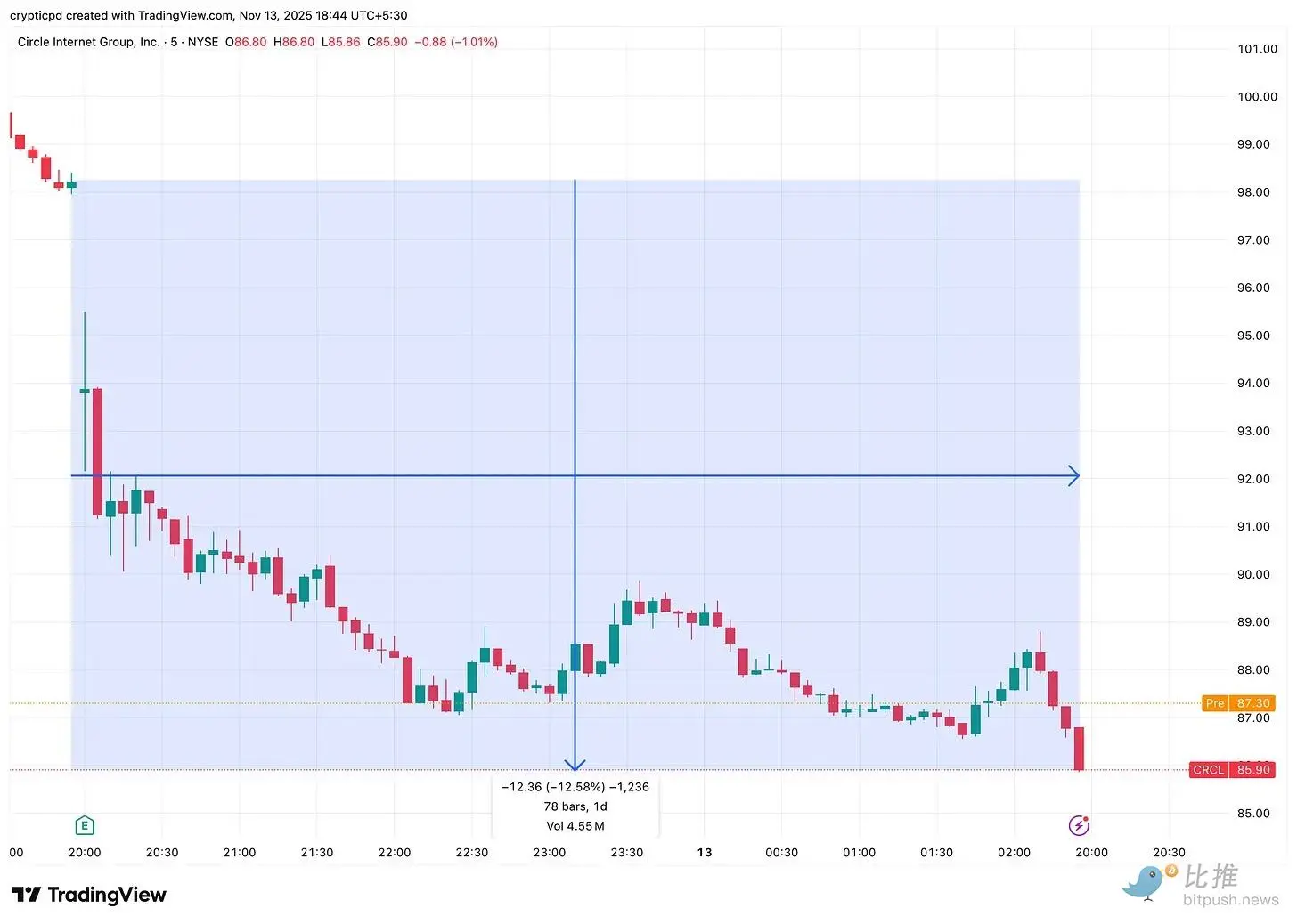 На бирже, несмотря на то, что Circle сообщила о лучших, чем ожидалось, прибылях, акции CRCL продолжают подвергаться давлению со стороны продаж. В среду акции упали более чем на 12%, завершив день на уровне 86,3 доллара за акцию, что является наименьшей ценой с момента закрытия в первый день на Nasdaq - 83,23 доллара.