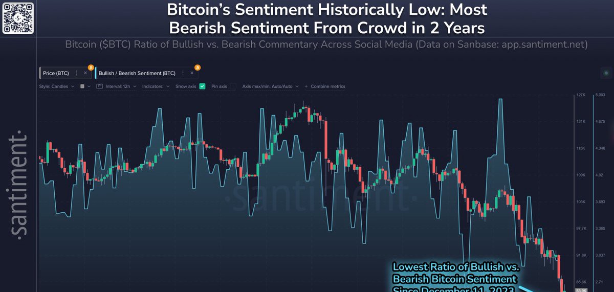 Источник: ETHNews Оригинальное название: Настроения по биткойну падают до 2-летнего минимума по мере усиления капитуляции розничных инвесторов Исходная ссылка: https://www.ethnews.com/bitcoin-sentiment-crashes-to-2-year-low-as-retail-capitulation-intensifies/ Социальное восприятие Биткойна упало до самого низкого уровня с 11 декабря 2023 года, согласно новым данным от Santiment, что является сигналом того, что розничные трейдеры сдают позиции с темпами, которые не наблюдались в течение двух полных лет. Резкое падение комментариев от быков к медведям на X, Reddit, Telegram и других платформах отражает рынок, охваченный паникой, разочарованием и истощением после недель неумолимого давления вниз.