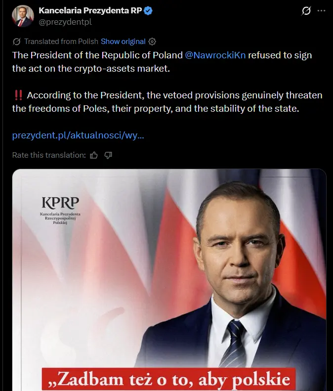 Законопроект, предложенный правительством премьер-министра Дональда Туска, был призван привести Польшу в соответствие с общеевропейской нормативной базой MiCA для крипторынков. Законопроект был внесен в июне, но не пережил президентского вето.
