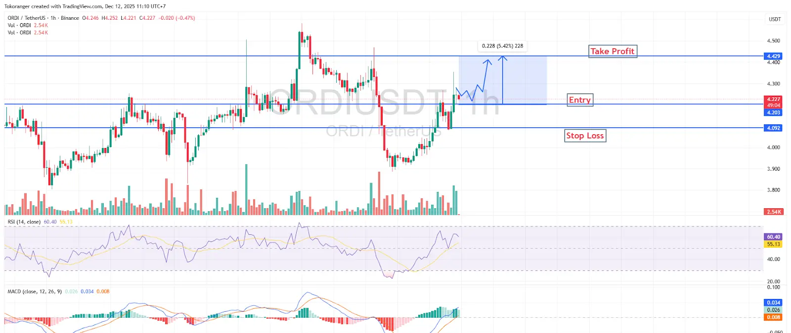 ORDI после отскока от уровня поддержки $4.09 демонстрирует значительную восстановительную активность, в настоящее время цена стабильно торгуется в диапазоне $4.20-$4.23. Начинает проявляться формация постепенного повышения локальных максимумов, что указывает на возвращение покупательской активности. RSI от зоны перепроданности отскочил и поднялся до диапазона 50-60, что усиливает сигнал о формировании восходящей динамики. MACD показывает быч crossover, что обычно предвещает продолжение роста.
