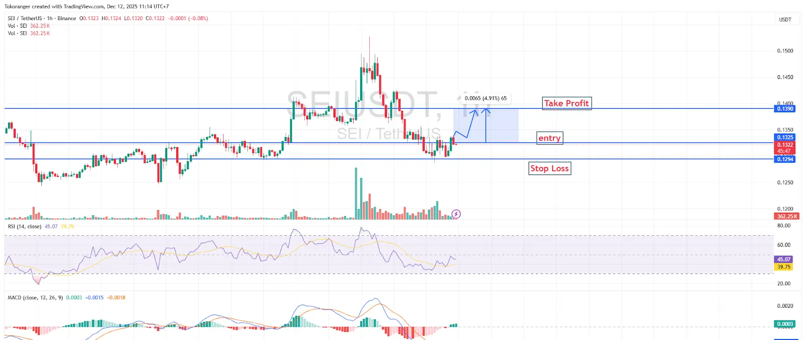 SEI успешно отскочила от уровня поддержки $0.1294, формируя структуру восстановления и демонстрируя восходящую динамику. При приближении к зоне входа $0.1325 объемы торгов умеренно растут, что свидетельствует о возобновлении активности покупателей. RSI находится в средней зоне, но начинает формировать восходящую наклонную линию, а MACD показывает потенциал восстановления после ослабления слабых красных гистограмм.