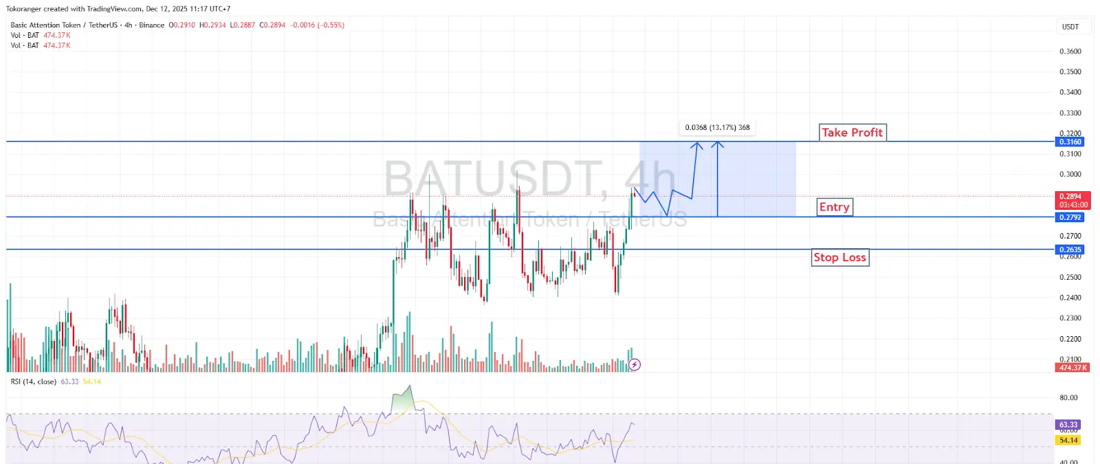 BAT отскочила от зоны спроса $0.2792, которая обычно обозначает начало накопительного этапа. Пока цена держится выше этого уровня входа, потенциал роста к сопротивлению $0.3160 остается открытым, особенно учитывая рост RSI, свидетельствующий о усилении покупательской силы. MACD приближается к бычьему crossover, что указывает на смену импульса.