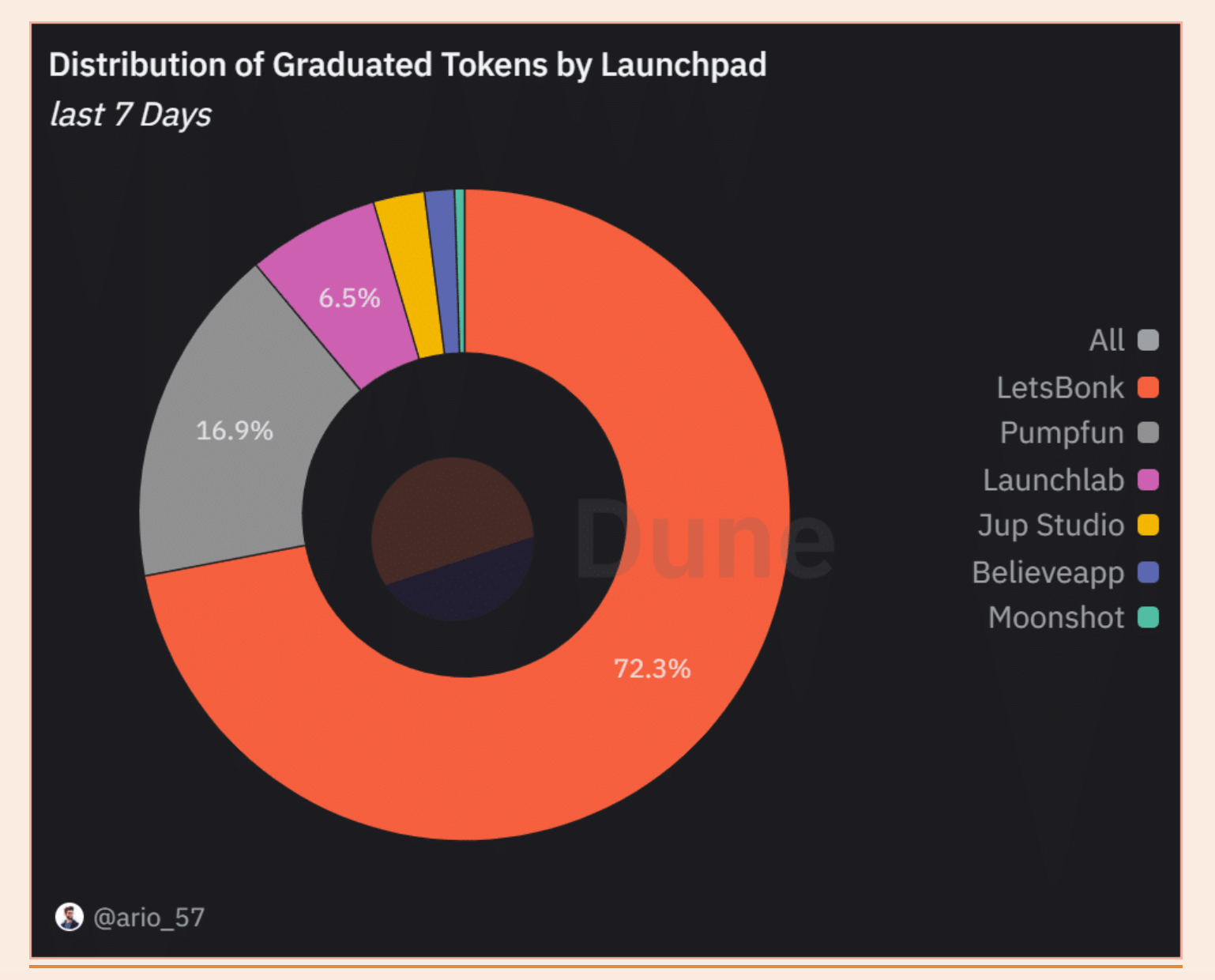 Ринкова частка: Екосистема основна платформа LetsBonk.fun наразі займає 72% частки всього ринку Launchpad, демонструючи абсолютне лідерство в екосистемі Meme-токенів.