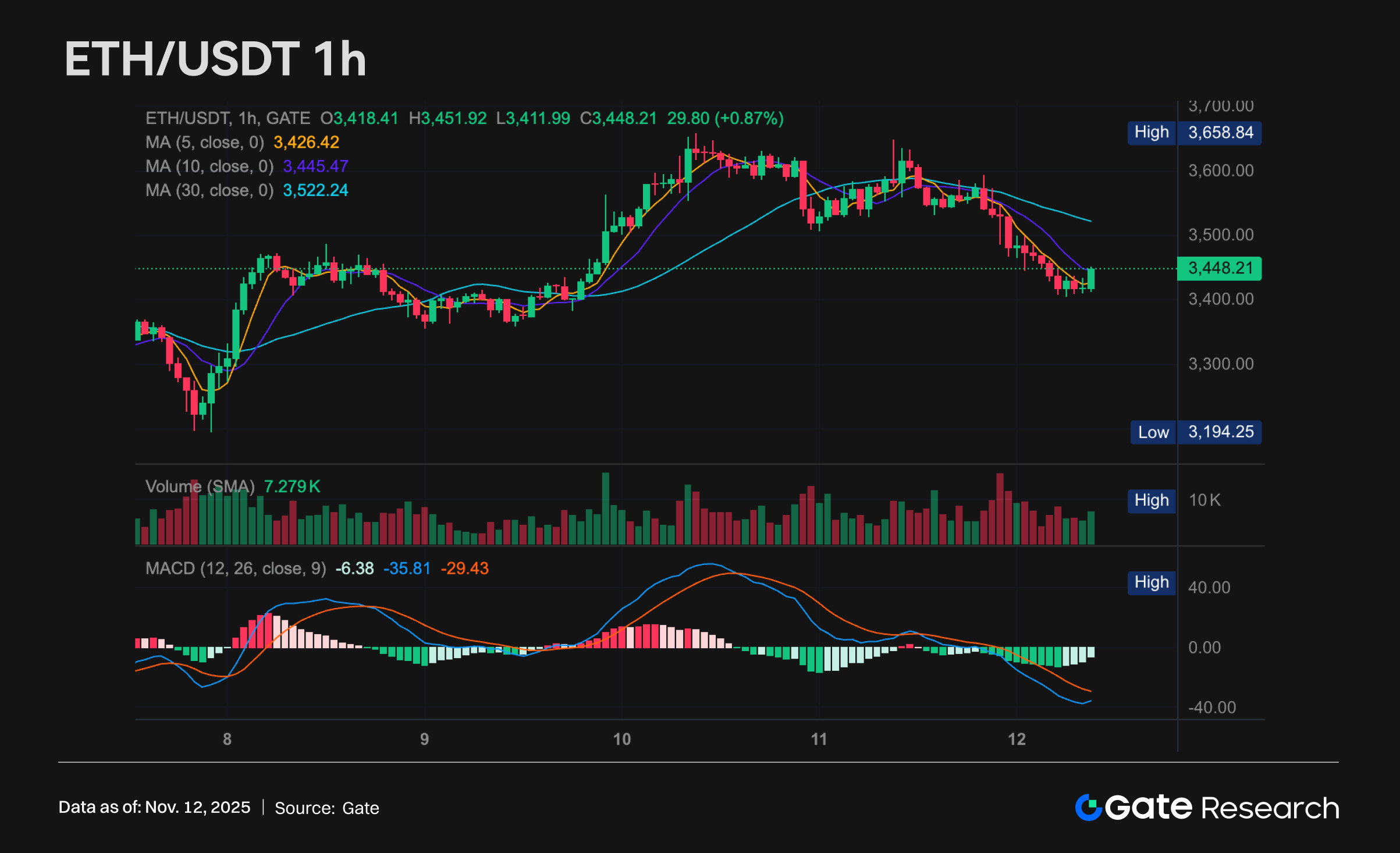 ETH також продовжує зниження від високих рівнів, знизившись з області 3,650 доларів до зони 3,400 доларів. Короткостроково, отримавши підтримку на 3,400 доларах, відновився зростання, MA5 та MA10 показують ознаки зміни, але все ще перебувають нижче MA30. Зелена смуга MACD помітно зменшується, швидка та повільна лінії наближаються одна до одної, що вказує на зменшення вниз імпульсу. Якщо ETH突破 3,520 доларів, можна очікувати підвищення до області 3,650 доларів; якщо знову впаде нижче підтримки в 3,400 доларів, це може призвести до повторного тестування низького рівня 3,320 доларів.