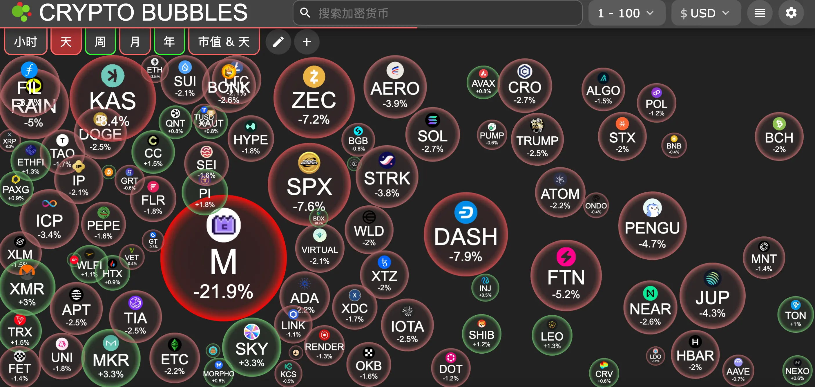 Сьогодні найбільше падіння серед 100 найбільших криптовалют за капіталізацією: MemeCore впав на 21,4%, Kaspa на 8,5%, Dash на 7,9%, SPX6900 на 7,5%, Zcash на 7,3%.