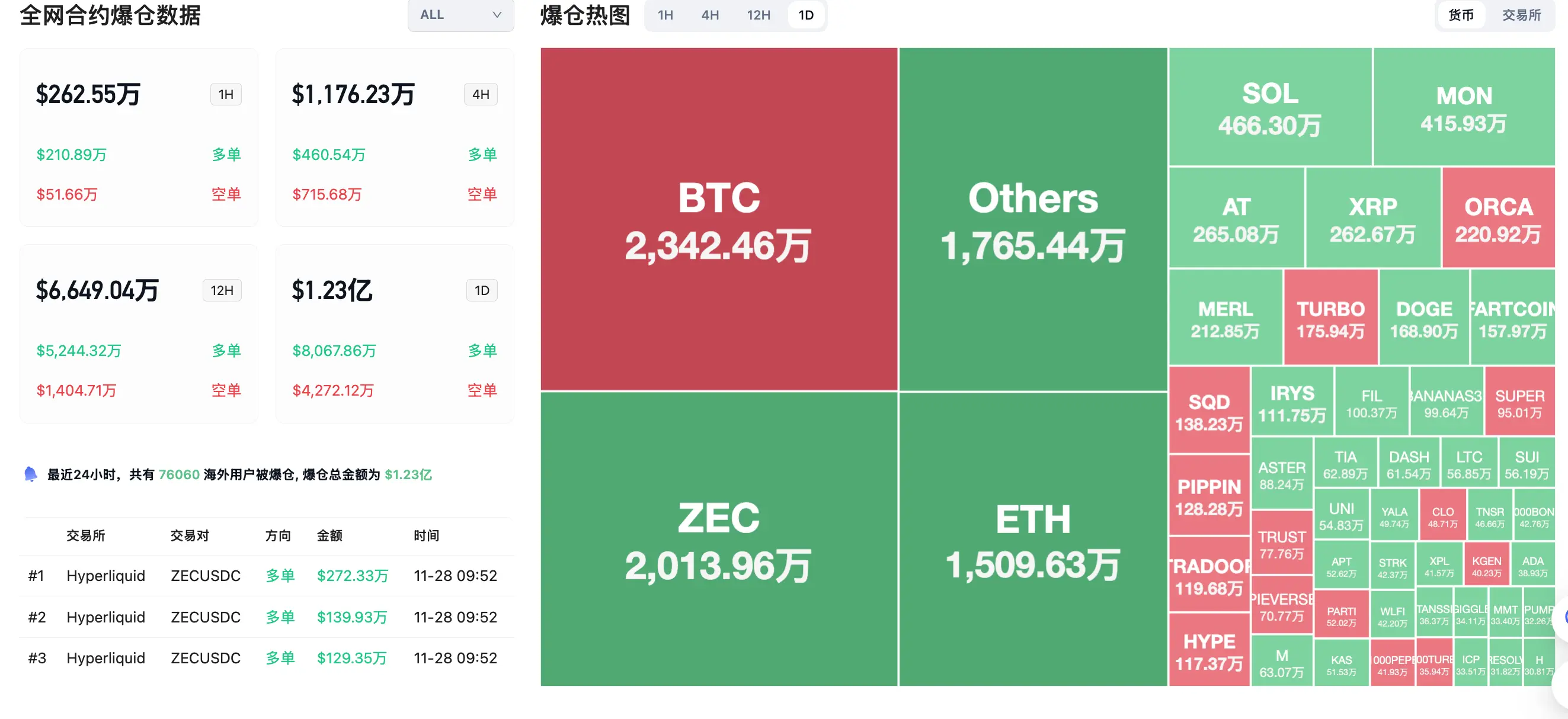 Дані про ліквідацію за 24 години: у світі ліквідовано 76060 осіб, загальна сума ліквідацій становить 1,23 мільярда доларів США, з них ліквідація BTC - 2342 мільйона доларів США, ліквідація ZEC - 2013 мільйонів доларів США, ліквідація ETH - 1509 мільйонів доларів США.
