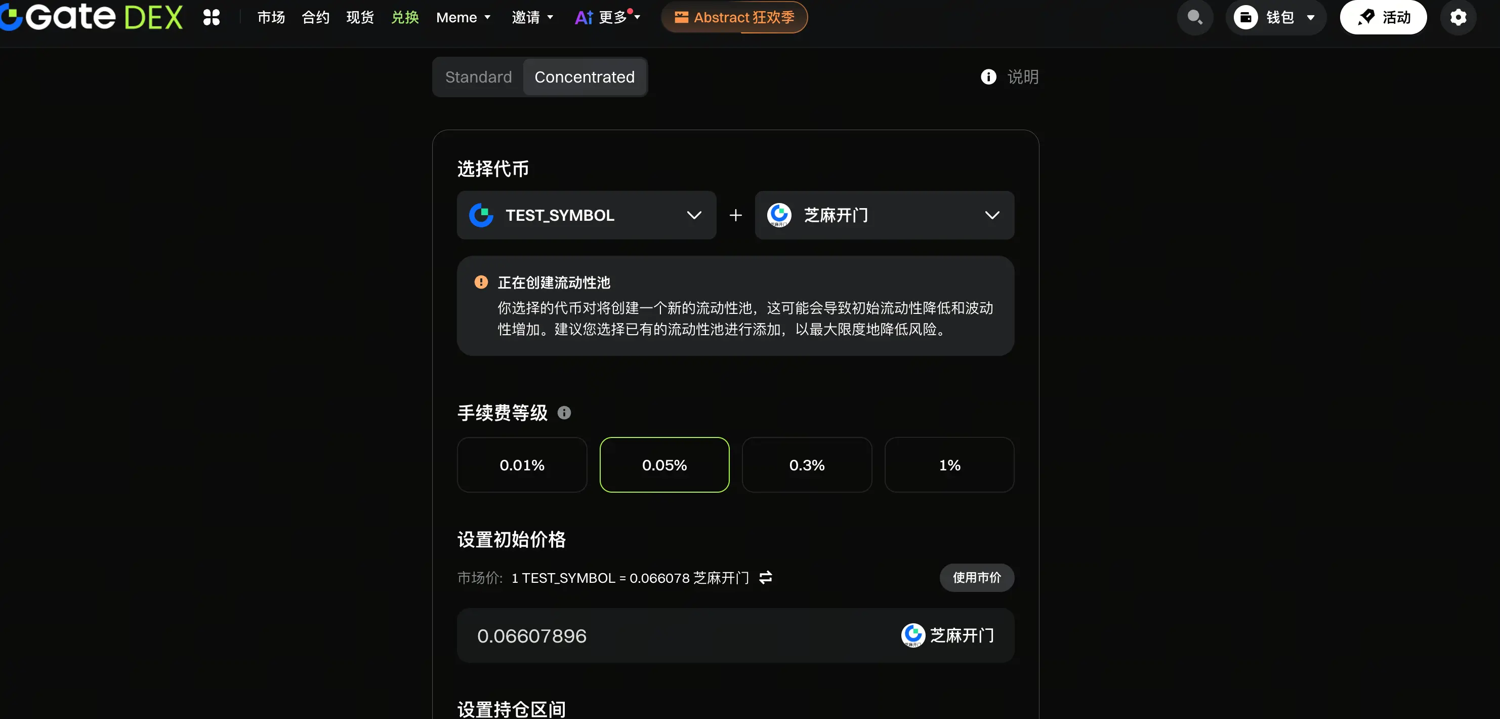 • 選擇交易對(如 ETH/USDT)並設定費率檔位(0.05% / 0.30% / 1.00%)。