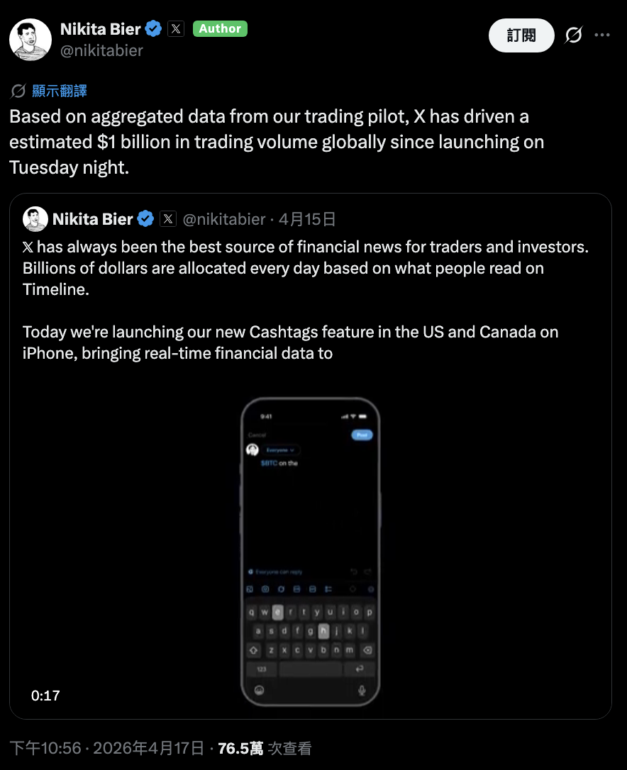 Соціальна платформа X знову демонструє потужну фінансову проникність. За повідомленням керівника продукту X Nikita Bier, опублікованим 17 квітня, ця платформа, яка у вівторок ввечері запустила нову функцію «Розумні теги» (Cashtags), за короткий термін у 3 дні внесла близько 1 мільярда обсягу торгів у світовий ринок. Ці дані походять із зведеної інформації пілотного проекту X для торгівлі.