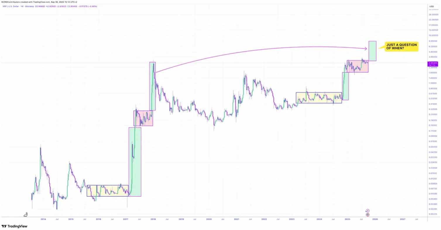 Ngược lại, nhìn vào các chu kỳ lịch sử, nhà phân tích CRYPTOWZRD nhận định XRP đang lặp lại “Bull run” năm 2017. Theo chuyên gia này, Ripple cần vượt qua mốc 3,65 USD để duy trì đà tăng.