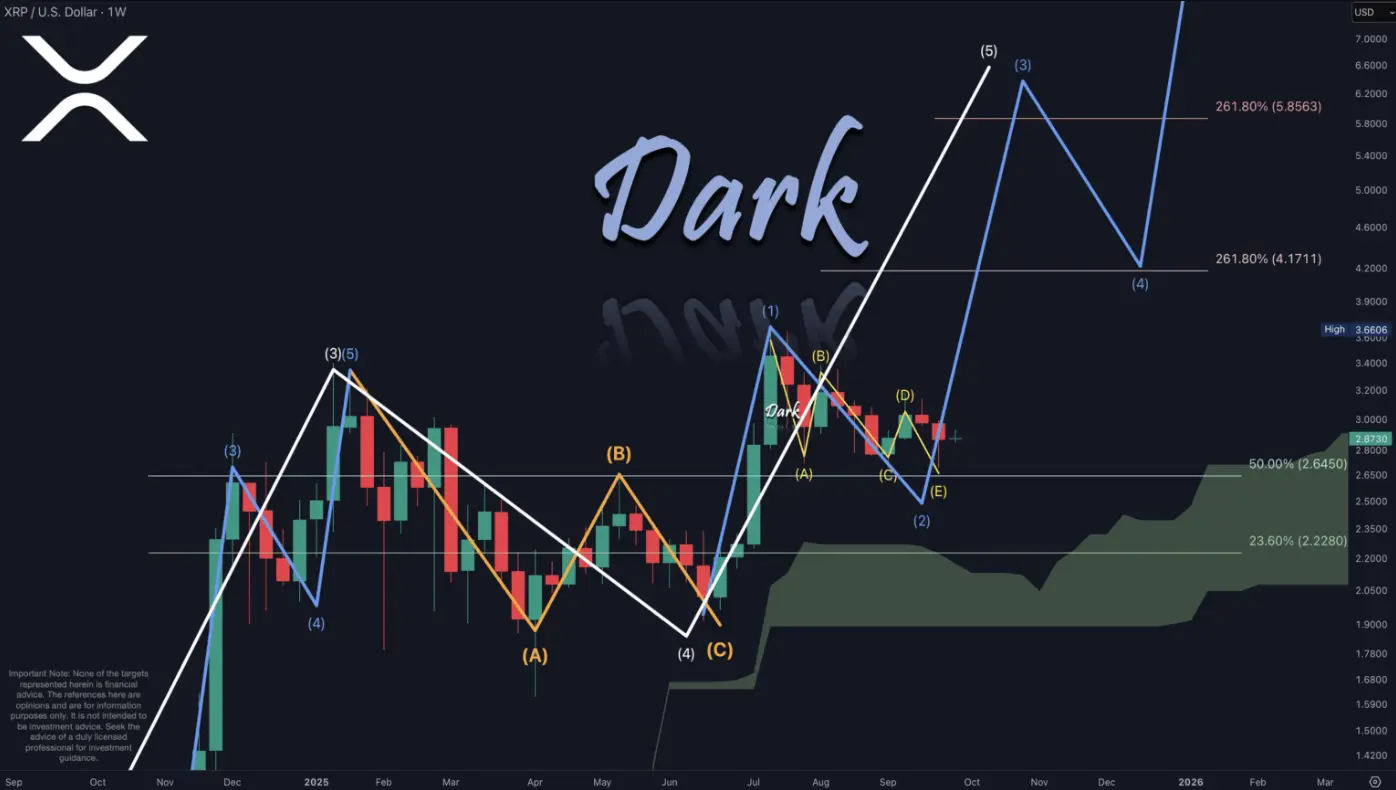 Trong một bài đăng gần đây trên X, nhà phân tích Dark Defender đã công bố biểu đồ và nhận định rằng đồng coin này vừa hoàn tất “Sóng thứ 4”. Ông lưu ý XRP hiện đang bước vào “Sóng thứ 5” và “sóng này vẫn có tiềm năng đạt mức hai chữ số.”