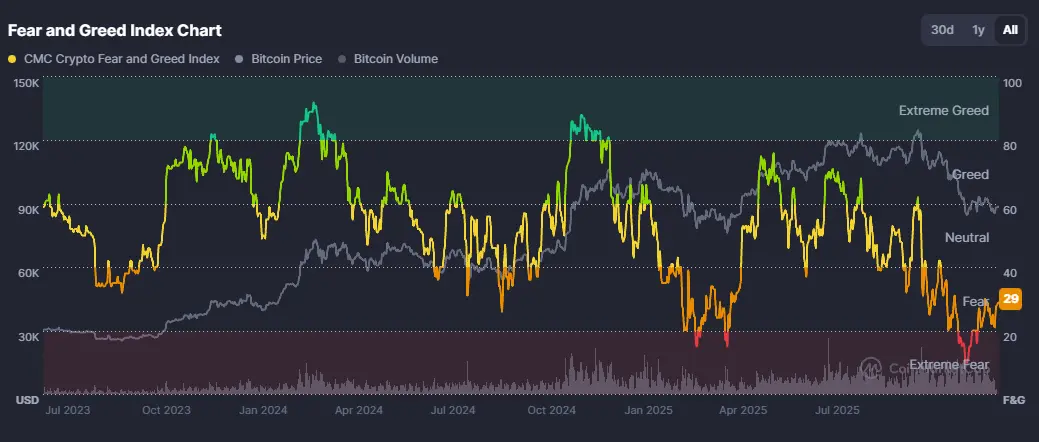 Chỉ số Sợ Hãi & Tham Lam (Ngày 23 tháng 12, 2025): 29 → Sợ Hãi