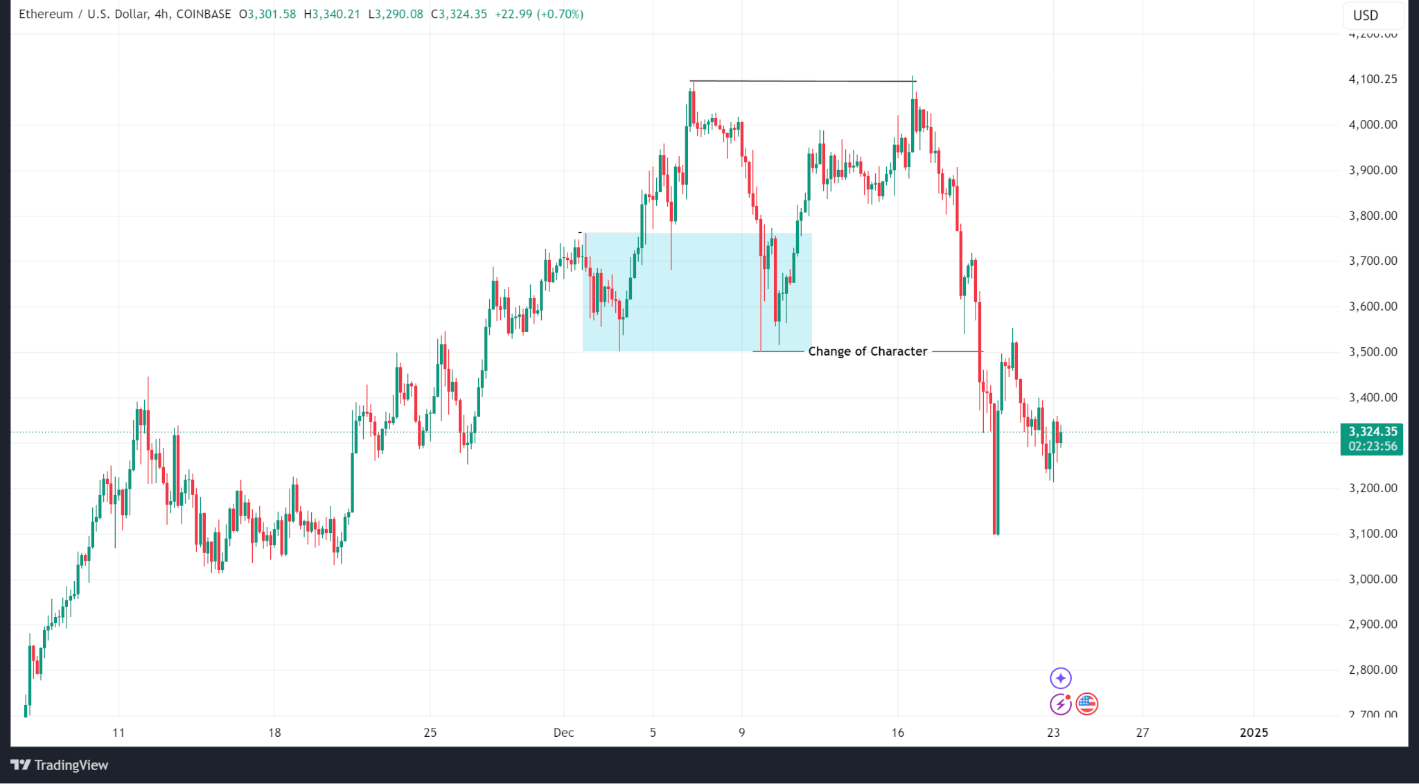 Khác với Bitcoin giữ vững cấu trúc tăng giá, giá Ethereum đã thay đổi đặc tính trên khung thời gian H4 để xu hướng giảm sau khi thử (nhưng không phá vỡ) đỉnh cục bộ tại 4.096,50 đô la.