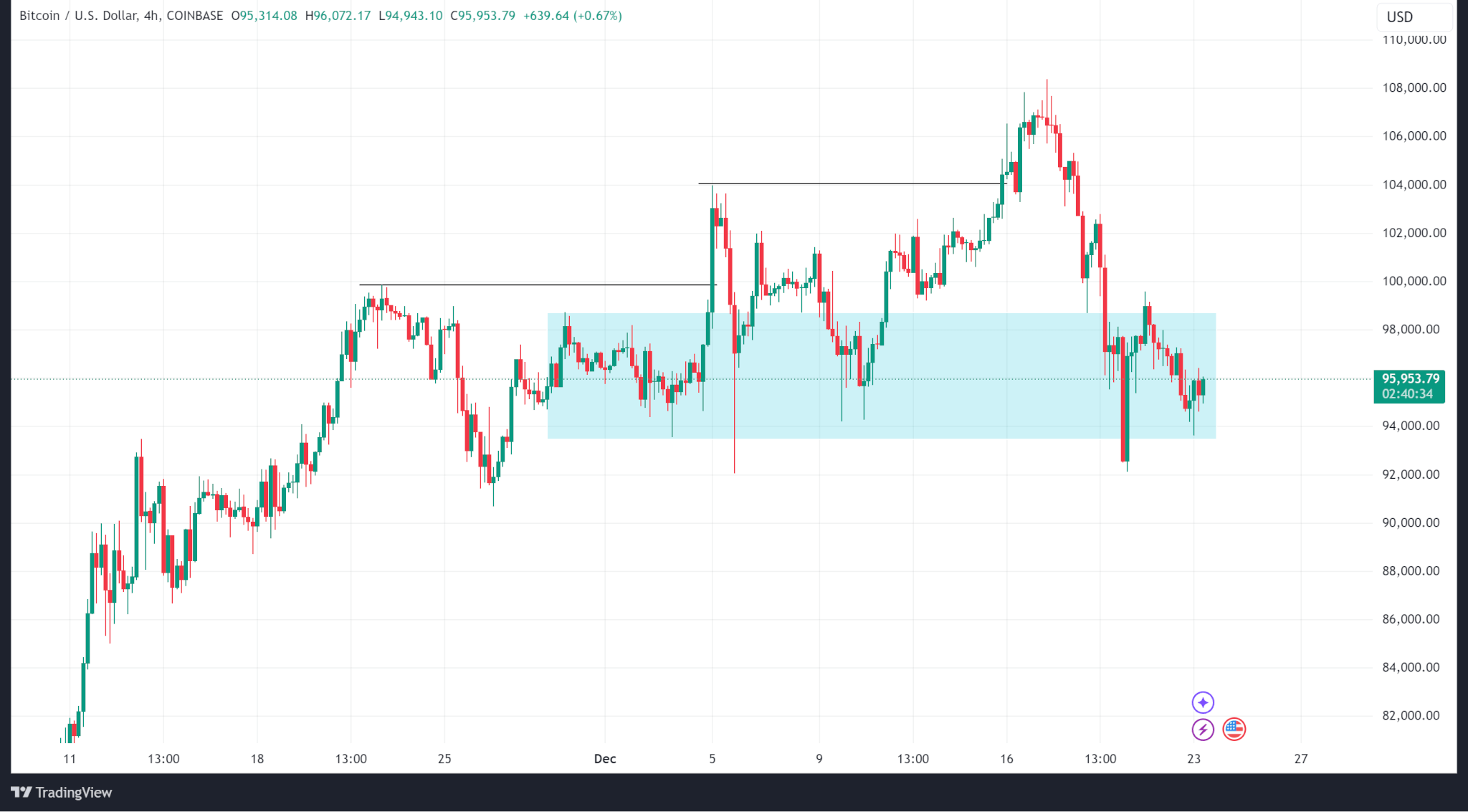 Giá Bitcoin giảm từ mức cao hàng tuần là 108.372 đô la vào ngày 17 tháng 12 xuống mức thấp 92.555 đô la trước khi kết thúc tuần quanh mức 97.700 đô la. Tuy nhiên, mặc dù giảm 9,7%, giá Bitcoin chưa thay đổi đặc tính theo hướng giảm.