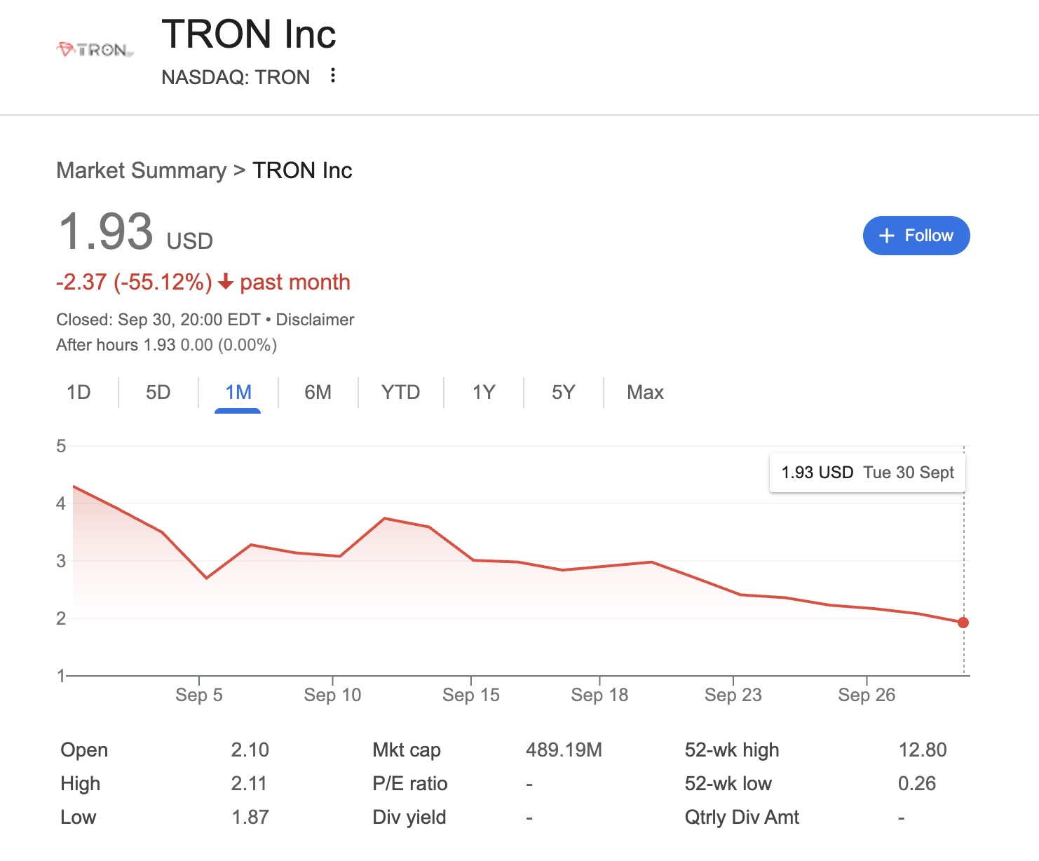 Tron Inc.,通過與 SRM Entertainment 的反向合並於 7 月在 Nasdaq 上架的公司,自 6 月 20 日達到 12.80 USD 的高點以來,股價已跌 85%。僅在 9 月,股價就失去了 55%,反映了持有數字資產的上市公司的整體趨勢。