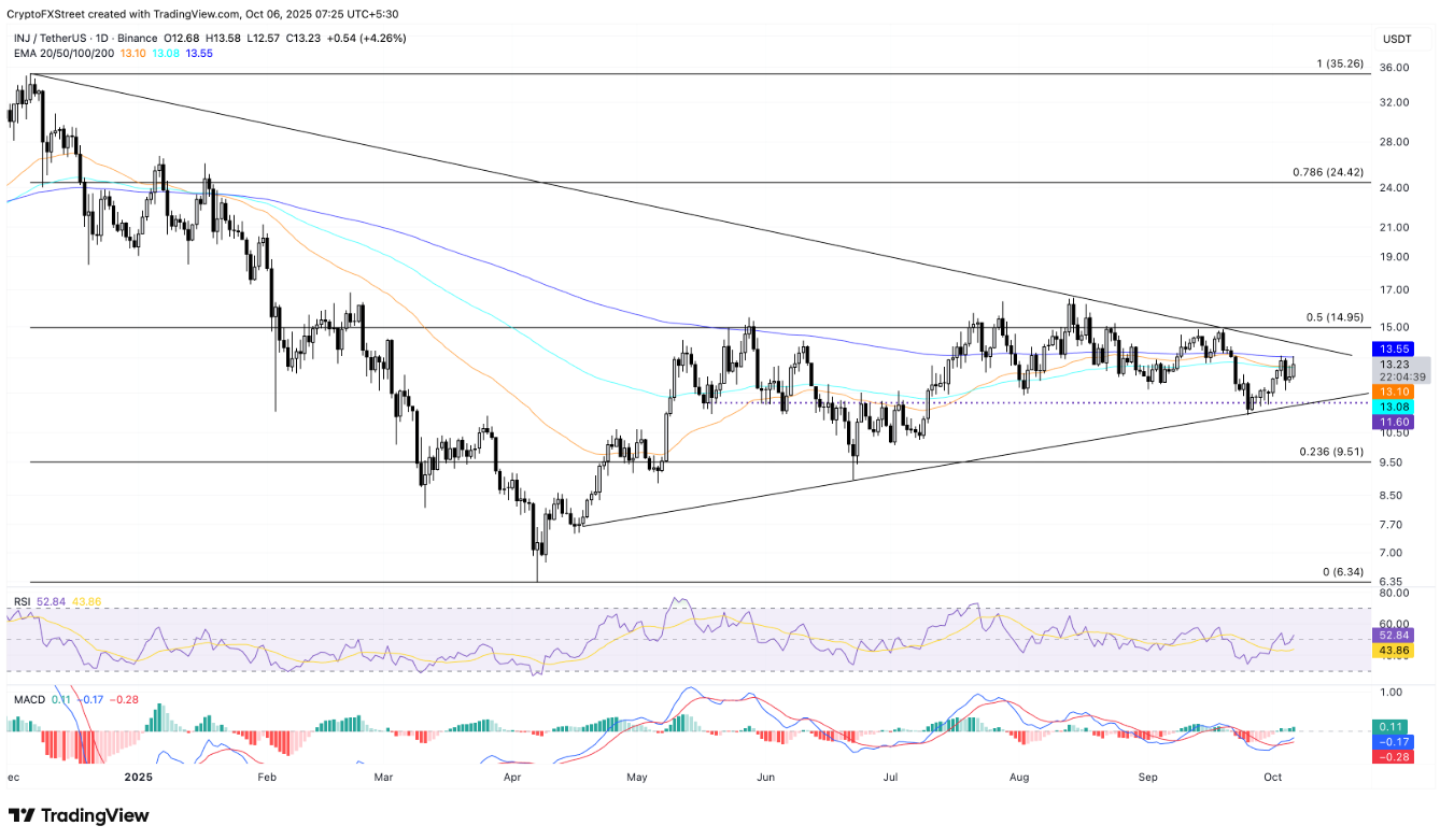 如果INJ能夠突破200日EMA,價格很可能會向上測試日線對稱三角形的上阻力線,約在14.20美元附近。不過,漲勢可能會在50%的斐波那契回撤位暫時停滯——約14.95美元,從35.26美元的高點(到6.34美元的低點)。