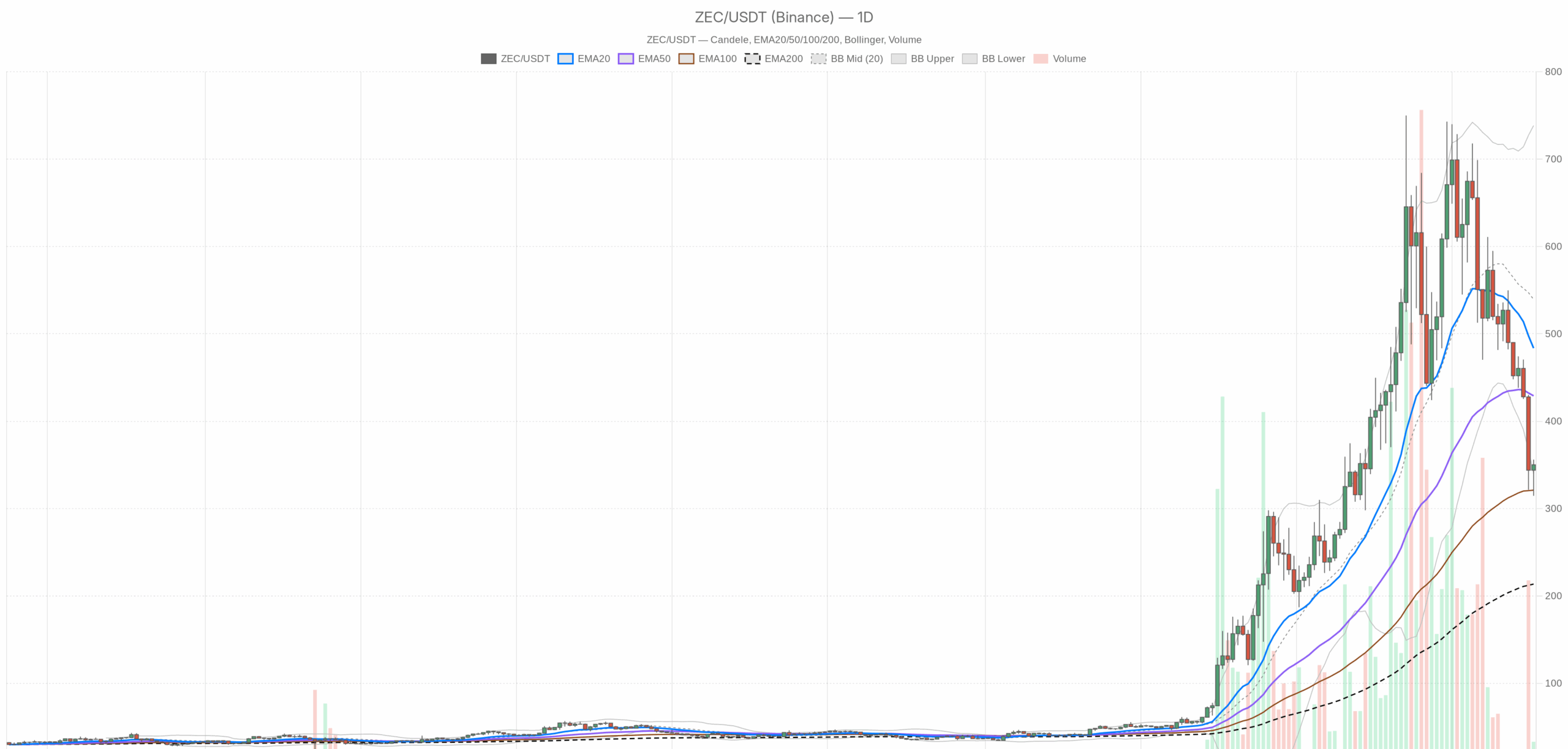ZEC/USDT — 日線圖,包含蠟燭圖、EMA20/EMA50 和成交量。