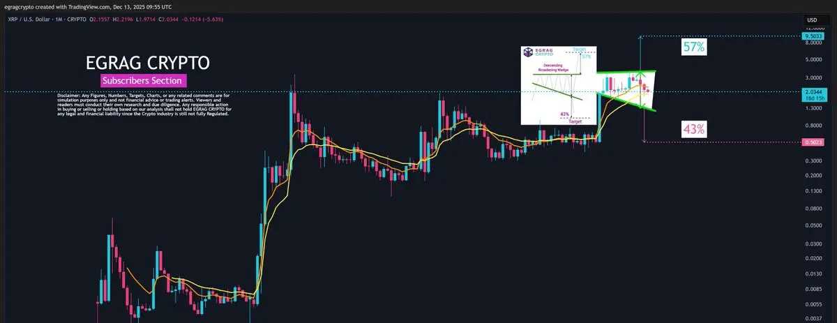 基於長期結構、時間對稱性和 EMA 排列,分析認為未來三到六個月 XRP 更可能向上運行,而非向下。