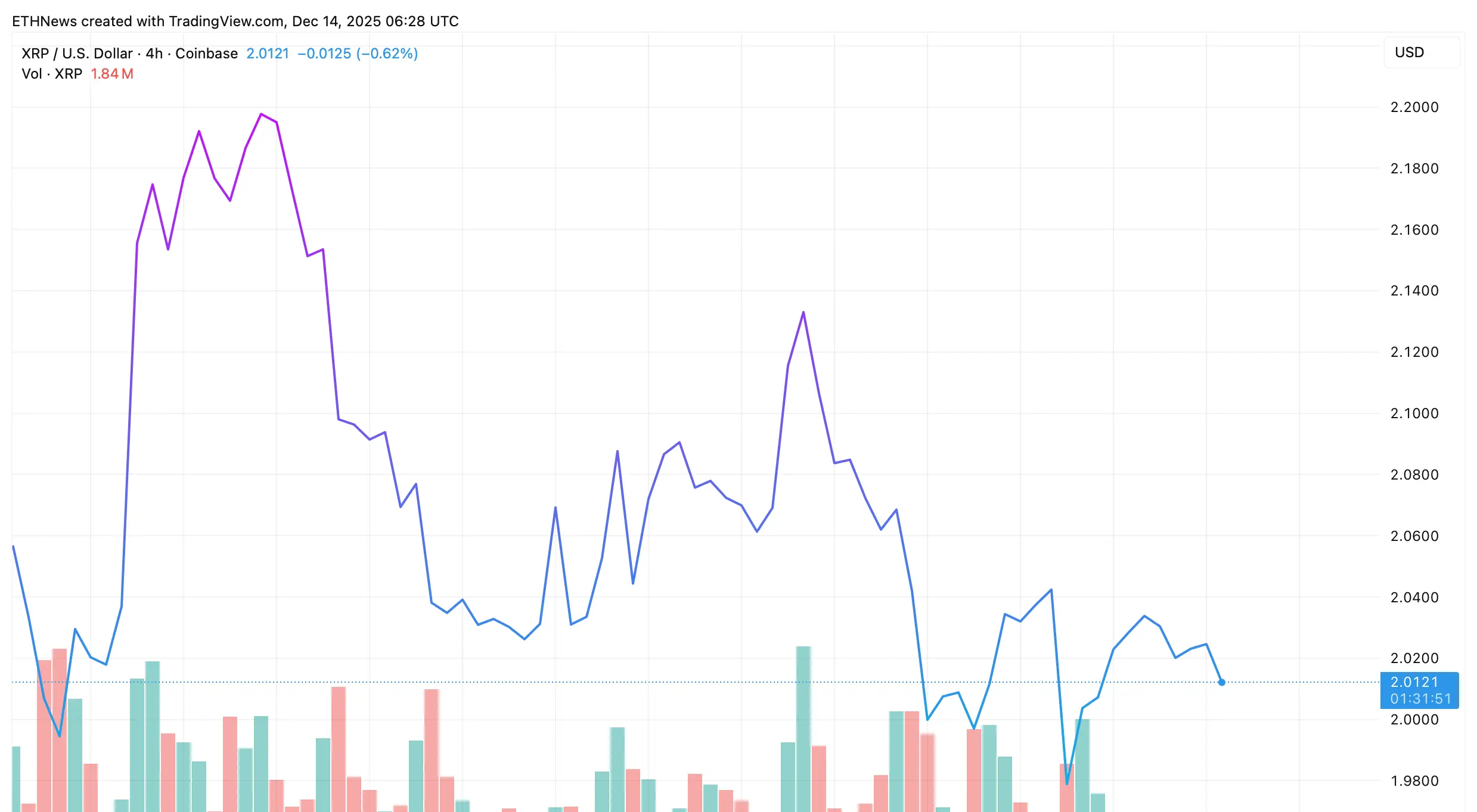 XRP 在過去幾個交易日中在$1.95 至$2.15之間波動,尚未出現決定性的跌破。交易動作仍然波動,但仍在較大整合通道的範圍內。