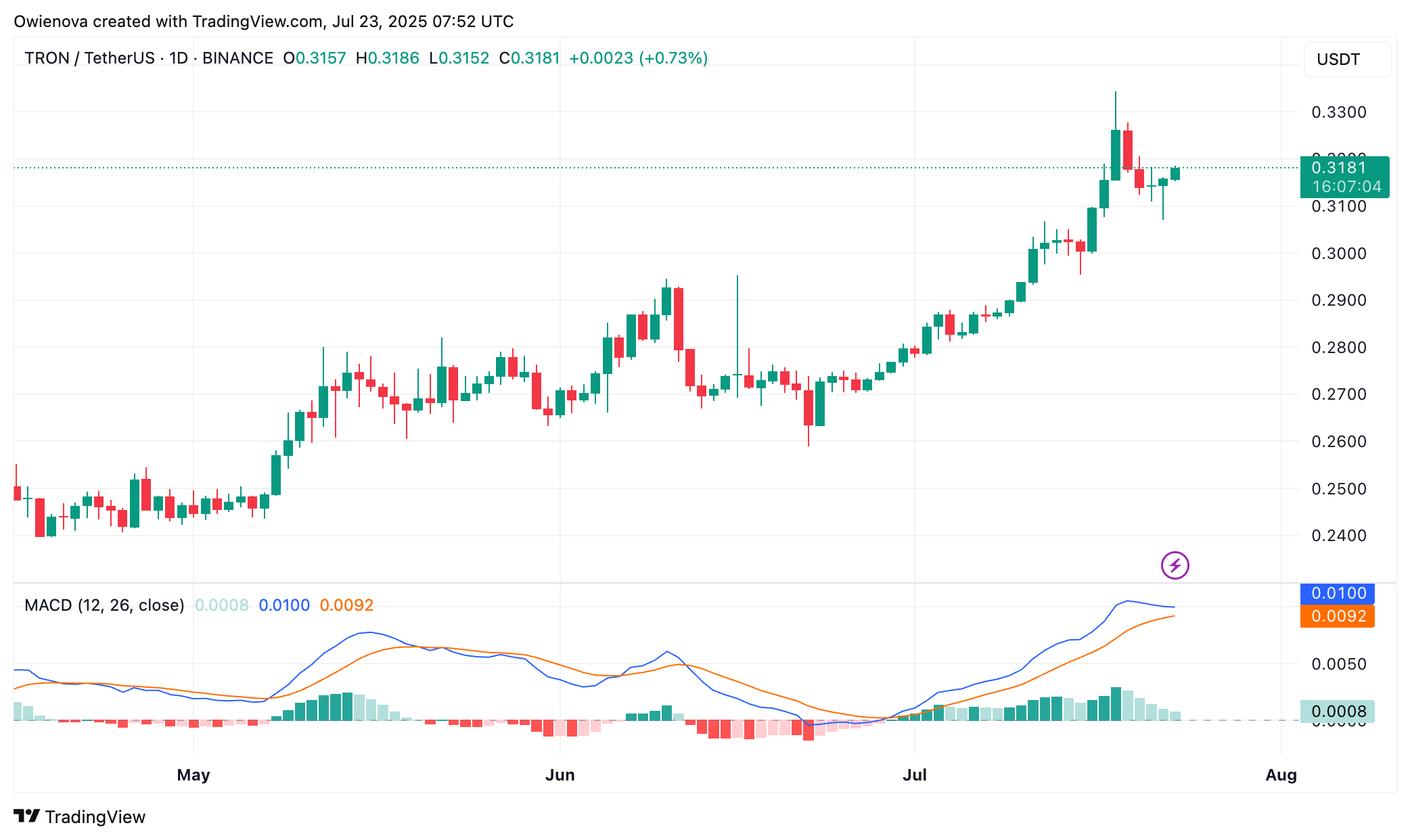 !TronTRX 在一维图表上交易价格为 0.31 美元 |资料来源:Tradingview.com 上的 TRXUSDT特色图片来自 Unsplash,图表来自 Tradingview.com
