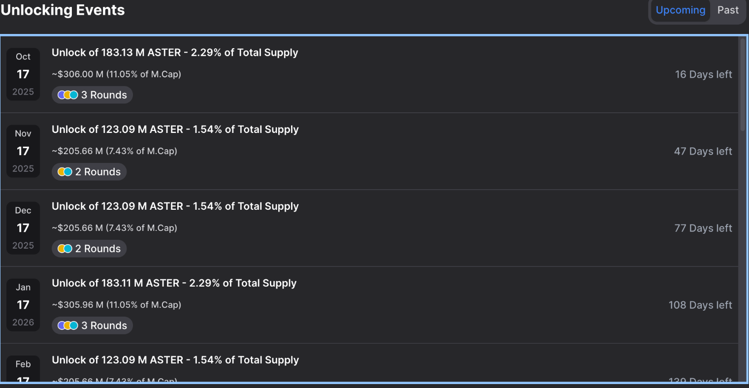 Quinten Francois,Coin Compass的主持人,周二在X账户上分享说,704百万个ASTER代币将于周三解锁,相当于总供应量的8.8%。这一举动使得流通中的代币数量在一天内从5%猛增至13.8%。
