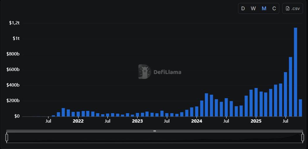 在一个历史性的里程碑中,去中心化交易所 Perpetual (Perp DEXs) 在九月份的月交易量超过了 1 千亿 USD,总共达到了 1,143 千亿 USD。这个数字比上个月增长了近 50%,标志着 Perp DEX 领域的最快增长。这一爆发反映了去中心化交易生态系统内日益增长的活动和接受度,越来越多的交易者参与到无需中介的永久合约中。
