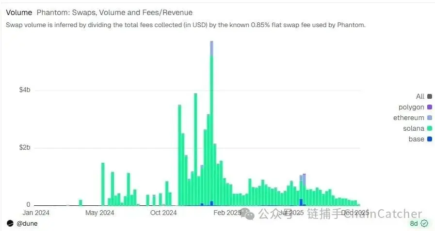 2025年对Phantom来说是冰火两重天:一边是用户和产品层面的快速突破,一边是交易量份额被交易所系钱包大幅蚕食。