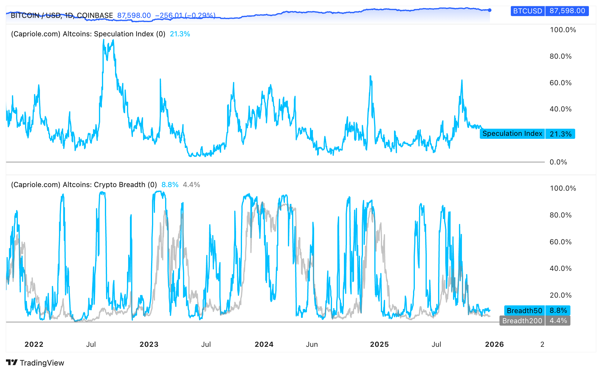 此外,加密市场广度——一个衡量市场强度的指标——显示只有8%的山寨币交易价格高于其50日移动平均线,这表明山寨币市场极其疲弱。