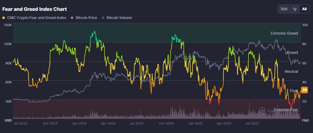 市场情绪 (CMC 恐惧与贪婪指数):29/100 → 恐惧区